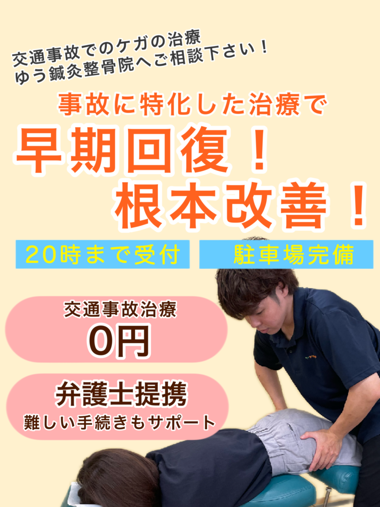 もしも交通事故に遭ってしまったら、ケガの程度にかかわらず、必ずゆう鍼灸整骨院へご相談ください。